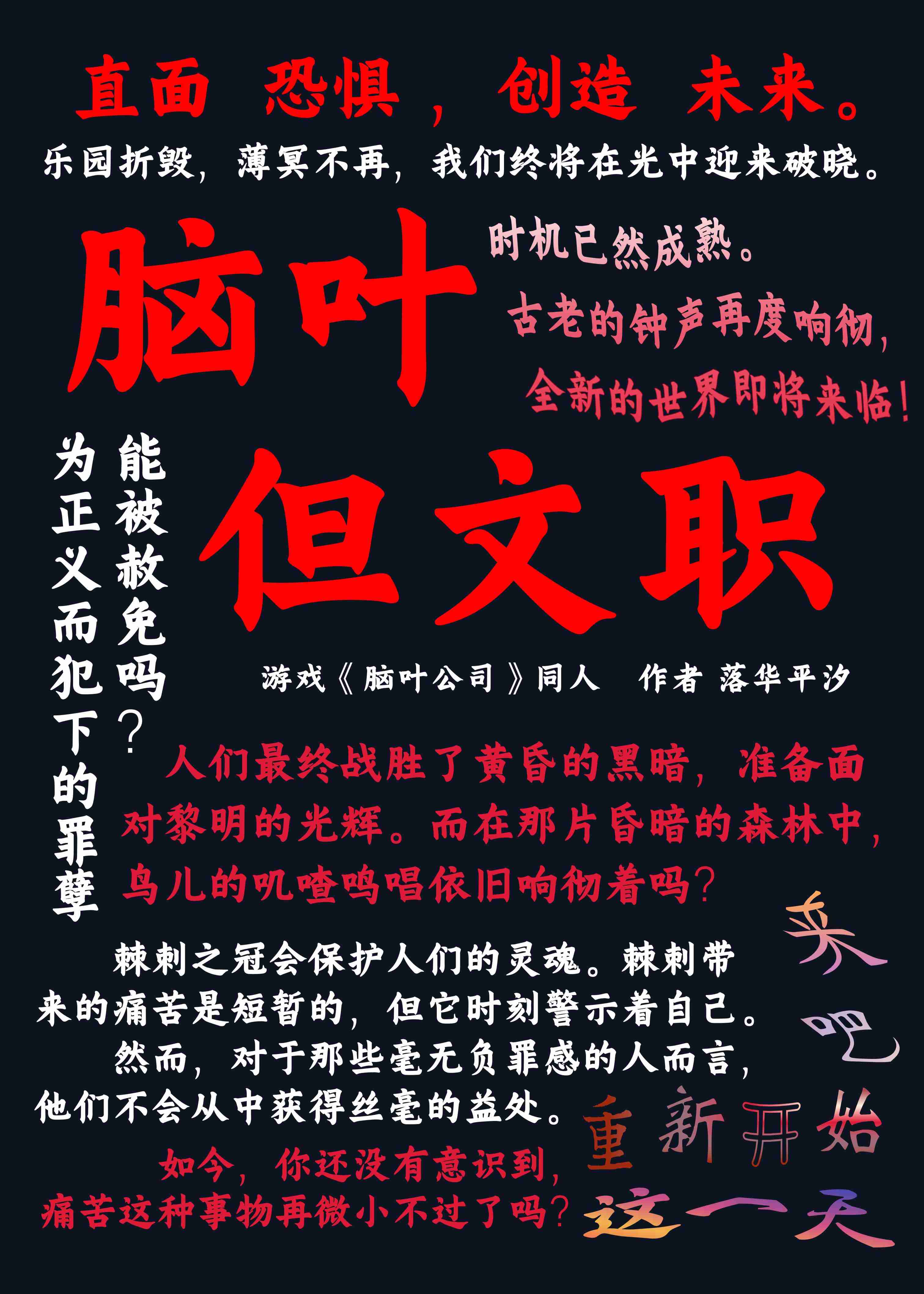 简介:【每周双更,周五周日更新,晚六点更新】 在脑叶公司,主管的优秀不容质疑。 强大的员工智勇双全,清洁的能源源源不断。 无人在意的的角落里,一批又一批的文职折损后又被迅速补充。 Bata34不甘心。 即使是脆弱的文职,也有对生的渴望。 主管总将那些会因职员死亡而出逃的异想体称之为【文保协】,多么可笑。 如果…… 能有一个真正属于文职的文保协,该多好。 Bata34期盼着。 脑叶公司同人文,一个脆弱文职的求生,目标是建立【真·文保协】立意:珍惜生命,远离危险,向阳而生。